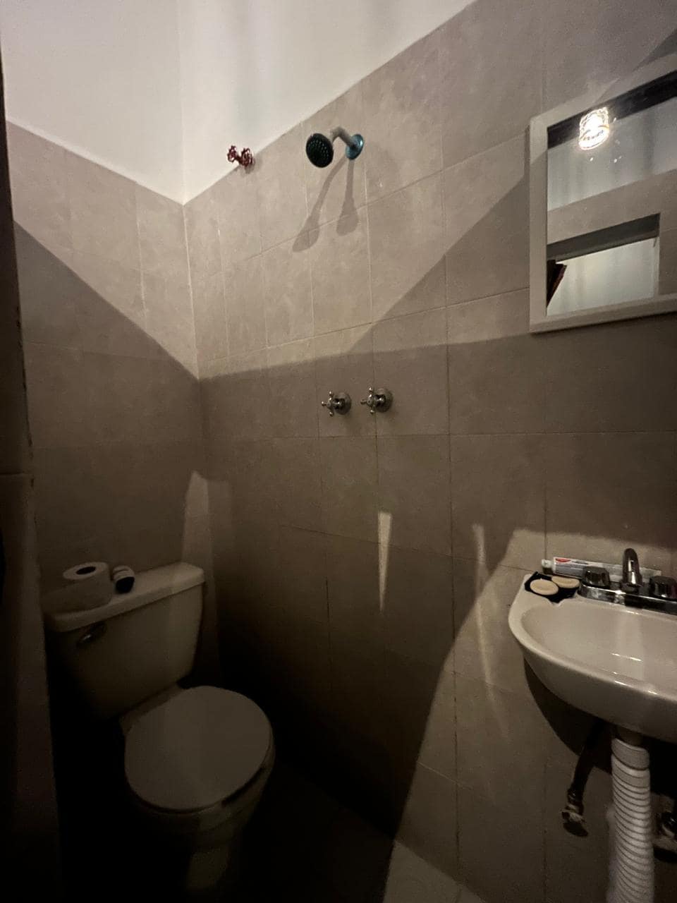 El baño tiene la regadera a centímetros de la tasa de baño y del lavabo. No tiene techo y la instalación eléctrica está expuesta.