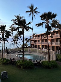 The room had a balcony with a great ocean view. The pool was small but very nice. This property seemed to attract young families. Our room had nice countertops, was nicely decorated, but the carpet in the living room was dirty. The shelves in the closets were rusty, so we hung our clothes instead. We had to park on the road under trees which made for a car covered in bird droppings every morning. It is a quiet condo. complex near Safeway and close to a great walking/biking trail. There is a game room with a ping pong table.